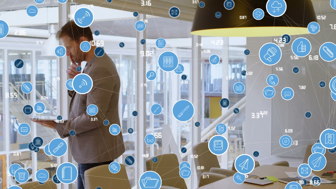 - Businessman Utilizing Network of Communication Icons in Modern Office
