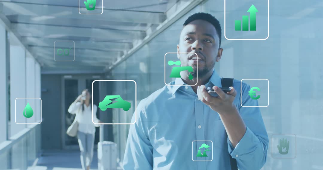 Young professional in airport speaking into phone, engaging smart technology for environment-related tracking. Floating eco icons signify various sustainable metrics. Ideal for representing modern business practices, tech innovation, eco-awareness in industry settings, and digital transformations in sustainability sectors.