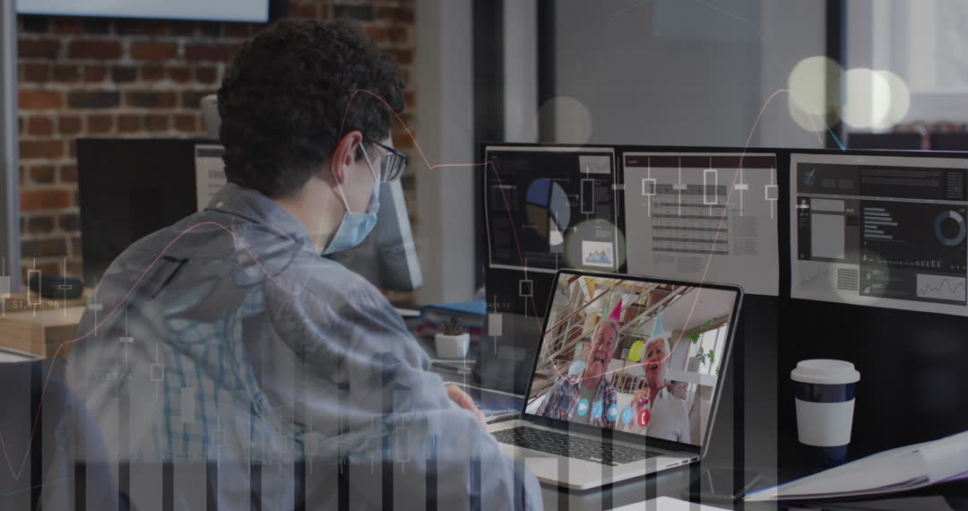 Person wearing face mask engaged in virtual meeting on laptop surrounded by data analysis screens. Useful for themes of modern workplace settings, remote collaboration, digital transitions, and data-driven decision-making in contemporary business environments.