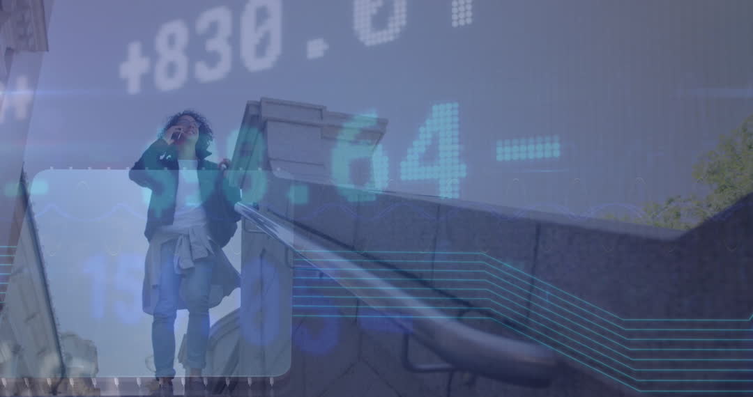 Visual highlights intersection of technology and business in urban environment. Features African-American businessman using smartphone, hinting at communication and real-time data processing. Overlaid numbers and graphs symbolize important economic or stock activity. Ideal for themes centering finance, technology, modern business, or commercial environment.