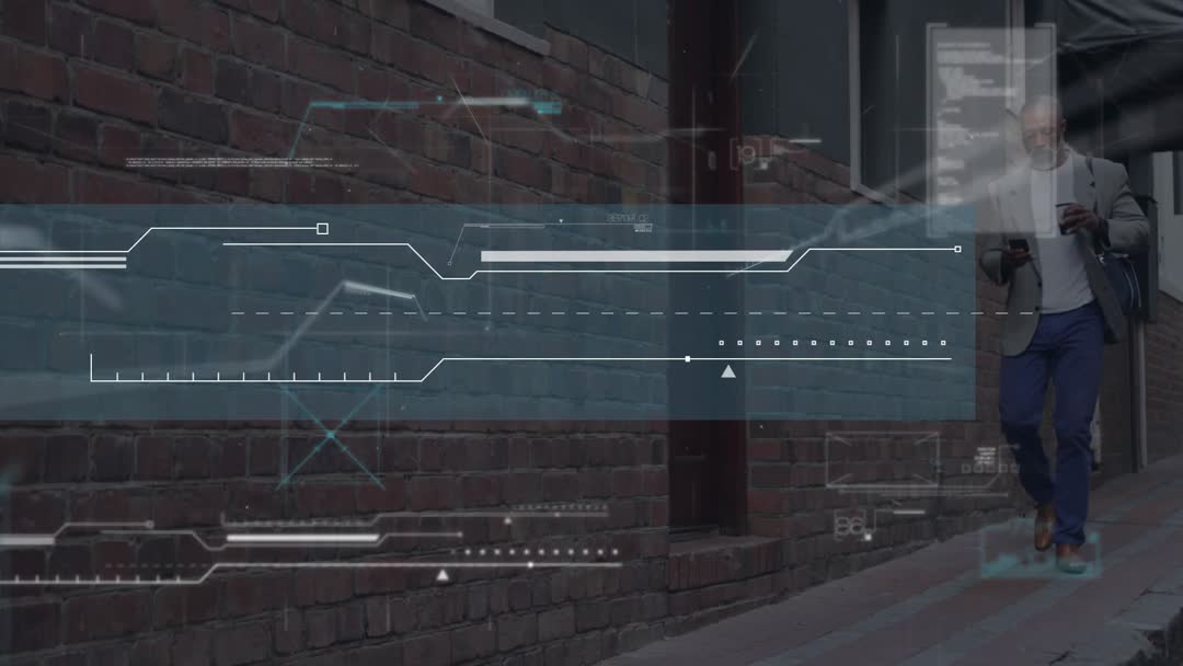 Scene showing businessman walking while checking smartphone and holding coffee beside brick wall with futuristic HUD data overlay and floating digital graphics. Video conveying integration of mobile technology into daily commute and illustrating AR interface layered over urban environment. Visual style suiting corporate tech marketing, digital product demos, app onboarding screens, website hero banners and social media ads. Usage ideas: Enhancing pitch decks and investor presentations, supporting blog posts about mobile productivity and augmented reality, illustrating cybersecurity or data analytics concepts, creating background for corporate training videos and internal communications. Composition leaving left-centered space for overlay text and branding, color palette featuring neutral tones with blue digital accents.
