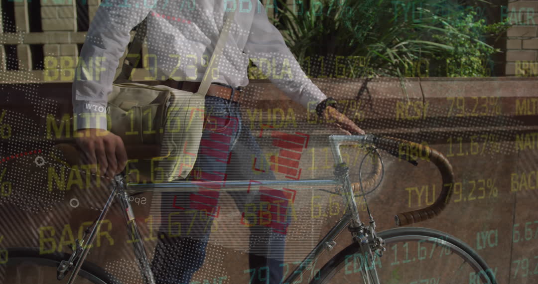 - Businessman Walking Bicycle Amidst Stock Market Data Overlay