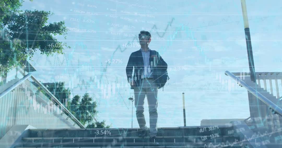Businessman walking down stairs with digital graphs and charts overlaying scene. Suitable for showcasing concepts of digital finances, data analytics, technological advancements in business, and modern economic development. Perfect for articles or advertisements relating to corporate finance, technology integration, or future economic trends.