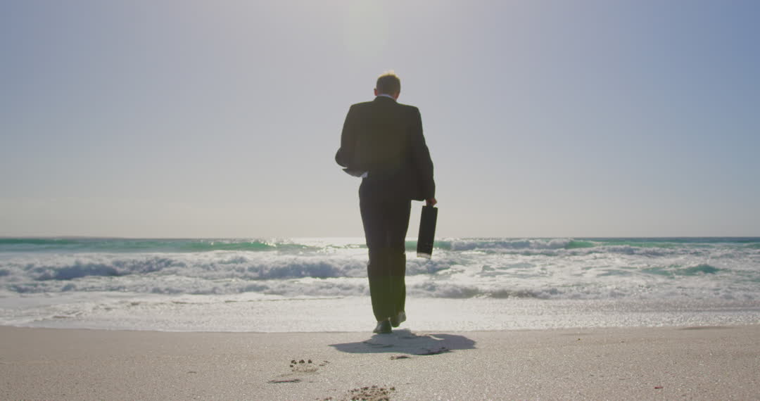 - Businessman Walking Towards Ocean on Sunny Beach