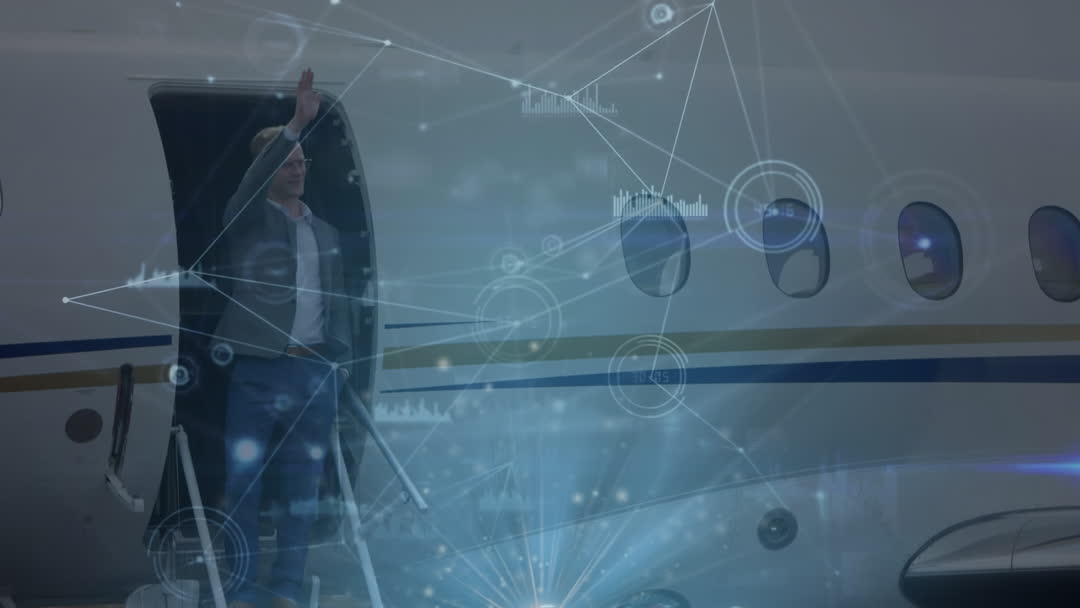 Businessman standing aboard private jet confidently waving with digital graphics representing networking and data compilation layered over the video. Suitable for illustrating concepts of executive travel, business networking, success, and the interconnected world of digital data. Useful for marketing campaigns for airlines, technology companies, or business consultancy firms seeking innovative visual representation.