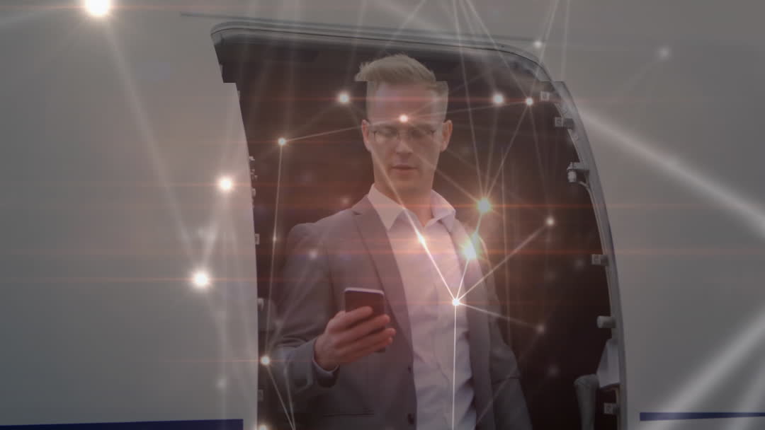 Depicts businessman exiting an airplane while using smartphone, surrounded by digital data network effects. Illustrates global connectivity and business technology. Suitable for topics related to digital transformation, global travel, modern business communication, and network security solutions.