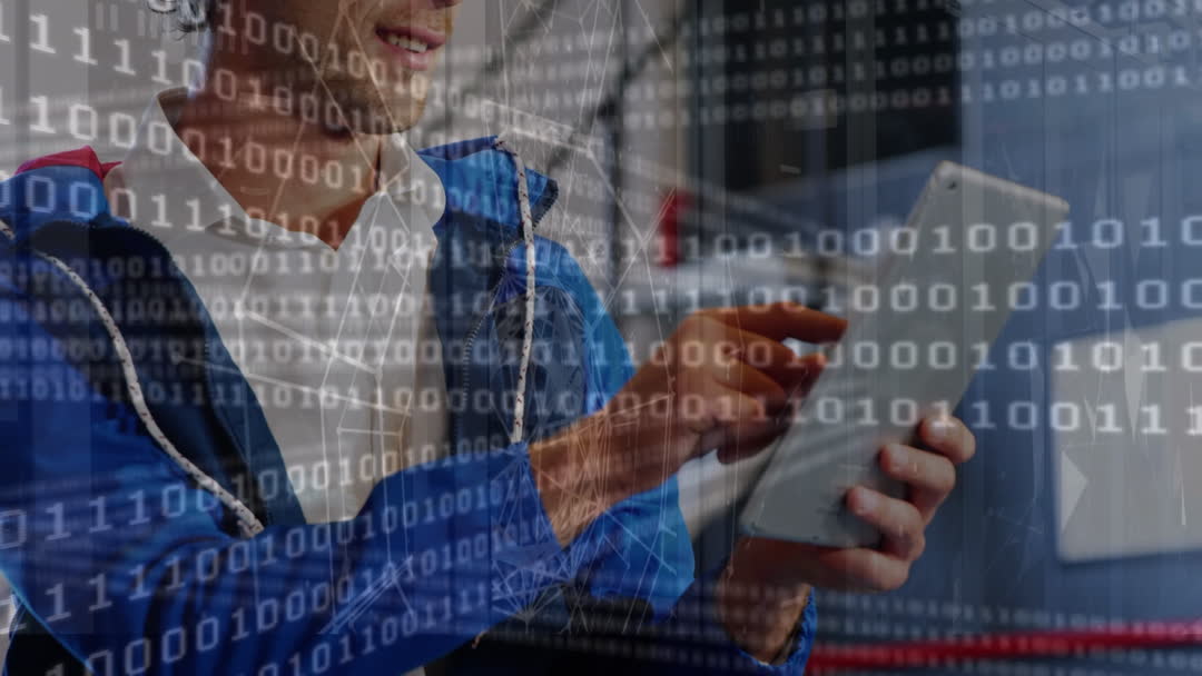 The video depicts a businessman using a tablet with binary code overlay, representing digital connectivity and data processing. Useful for business presentations, articles on digital transformation, and IT industry topics emphasizing technological advancements and data-driven solutions.