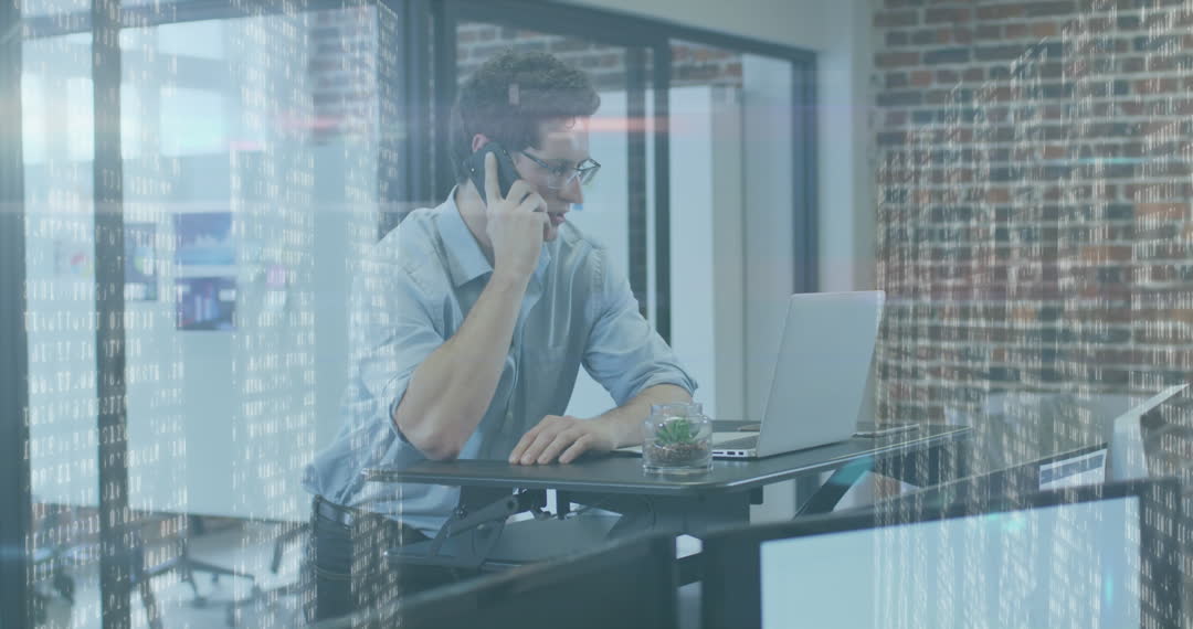 Caucasian businessman engaged in phone call while working on laptop in contemporary office space, characterized by digital overlay indicating tech and connectivity. Useful for illustrating modern business communications, remote working, and tech industry concepts.