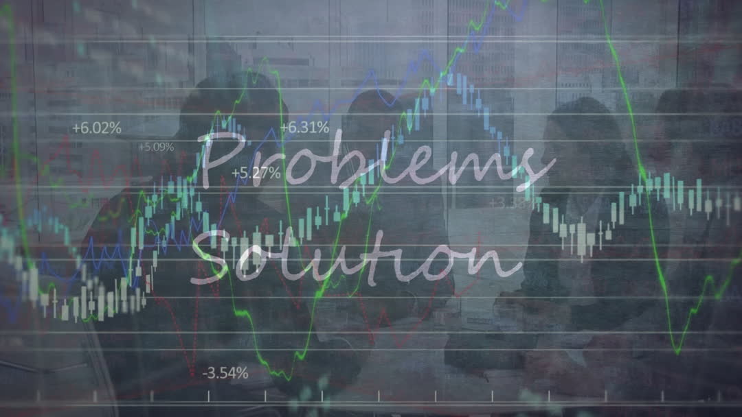 Overlays of stock market data with text highlight a structured problem-solving approach for efficient business strategies. Suitable for articles on business optimization, financial planning, strategy development, or educational content on market analysis and innovative solutions.