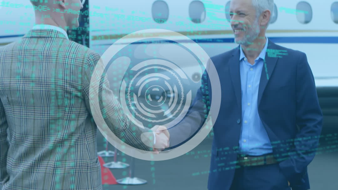 - Businessmen Shaking Hands at Airport with Digital Interface Overlay