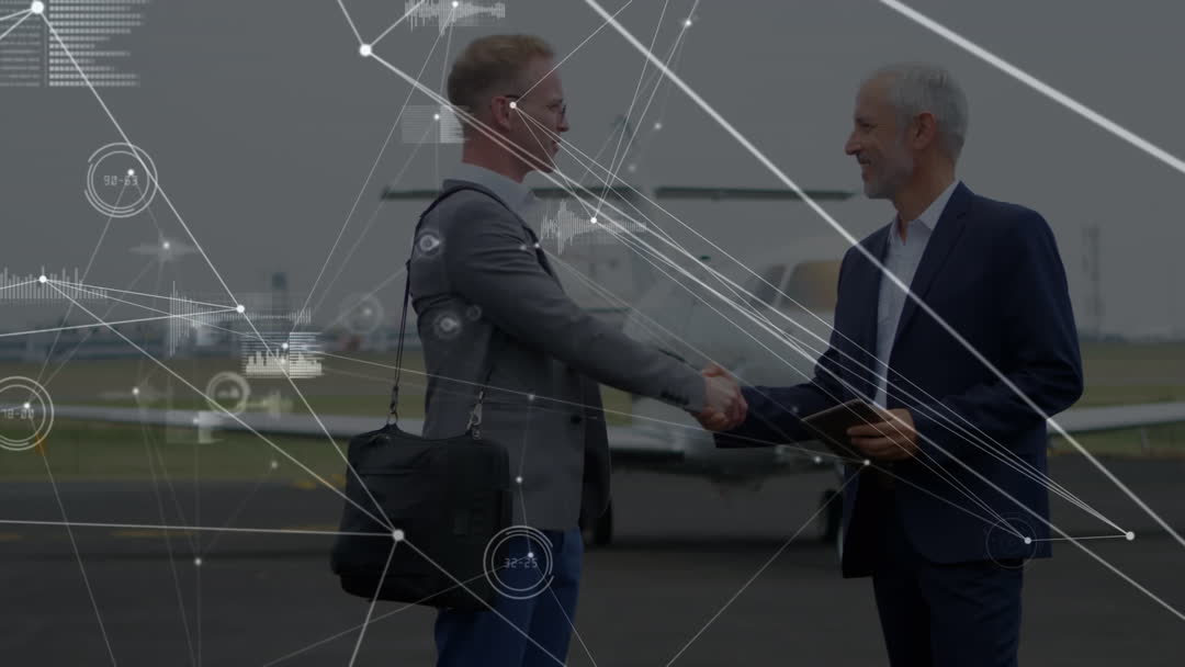Businessmen are standing near an airplane, shaking hands, symbolizing successful collaboration and partnership. The digital connections overlay depicts the concept of global networking and technological advancement in business. This videory is ideal for illustrating themes related to global business travel, networking, technological collaborations, and modern business agreements in presentations, websites, or advertising.