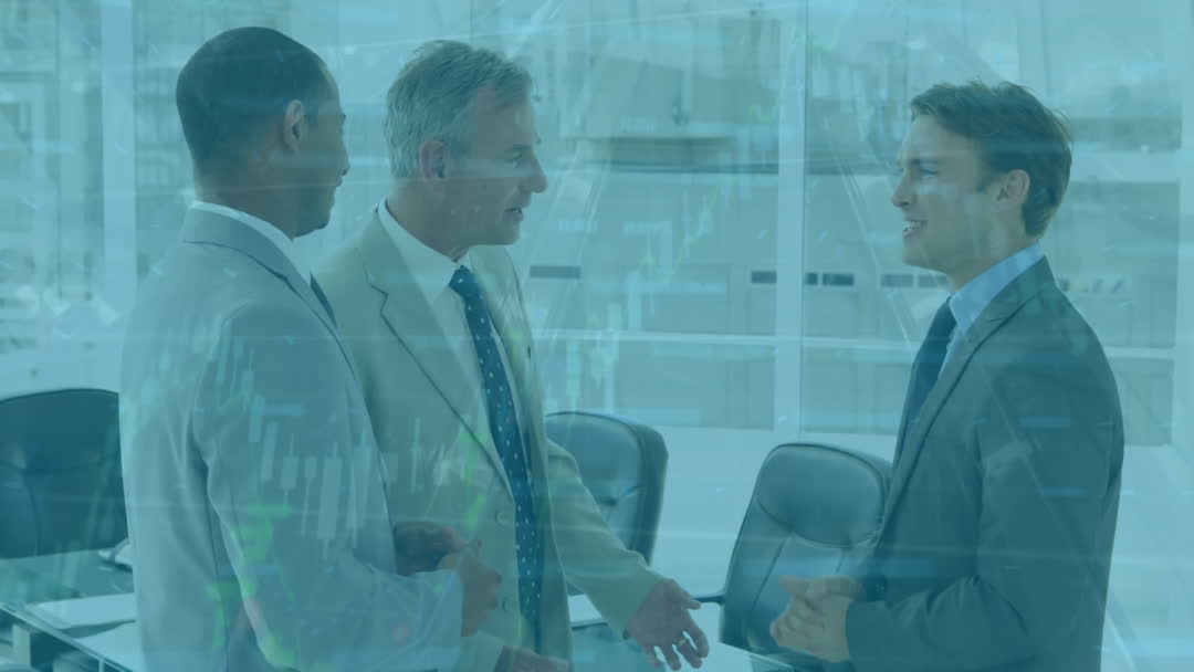 Three diverse businessmen are engaged in a strategic discussion with a visual overlay of financial data. This underscores themes of finance, business technology, and teamwork. Ideal for articles on corporate strategy, international business cooperation, and financial analysis in a modern digital context.