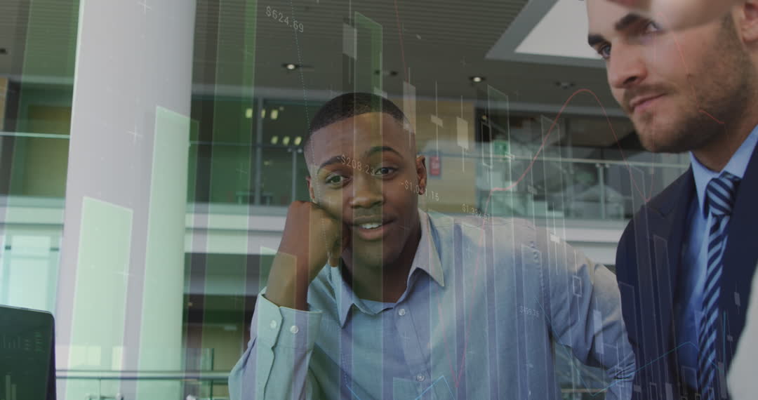 Two diverse businesspeople engage in discussion with a backdrop of animated financial graphs in a modern office. This video captures elements of digital technology and data analysis in a corporate setting, emphasizing global business connections and professional interactions. Ideal for use in business presentations, financial consulting material, and articles on integration of technology in business environments.