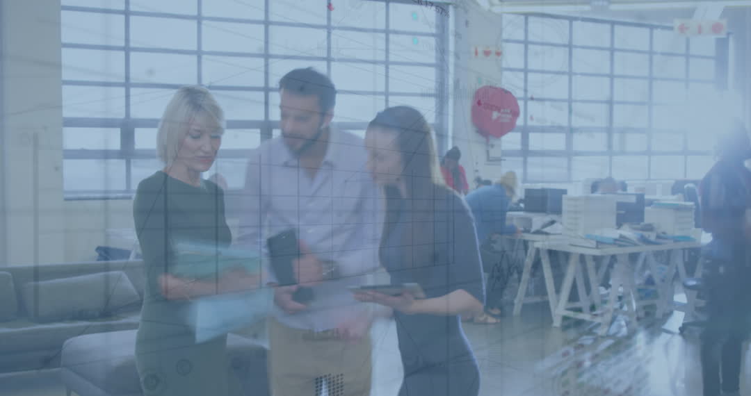 - Businesspeople Collaborating in Modern Office with Financial Data Overlay
