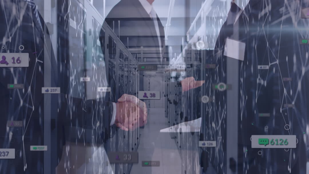 Image depicts two businesspeople shaking hands in a data center environment, juxtaposed with digital icons representing social media interactions. This conveys a concept of business networking, data connections, and digital partnerships. Ideal for use in articles or marketing materials focused on digital business evolution, technology in business growth, or social media analytics features.