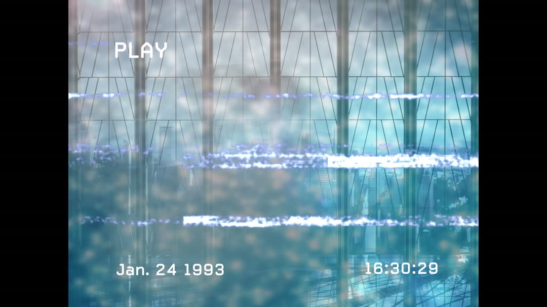 Business individuals are seen walking against a backdrop of digital interference patterns reminiscent of a '90s aesthetic, with timestamp overlay. This can be used for creative projects related to innovation in technology, retro tech visuals, or exploring the impact of globalization in businesses. The interference suggests a conceptual depiction of digital transformation in a corporate environment.