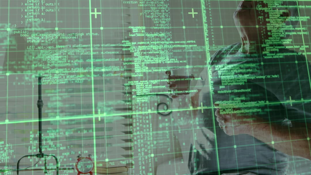 Businessperson standing behind projected digital codes and data analytics. Represents integration of technology and business processes in a digital era. Can be used for topics on innovation, data analysis, or global business functioning.