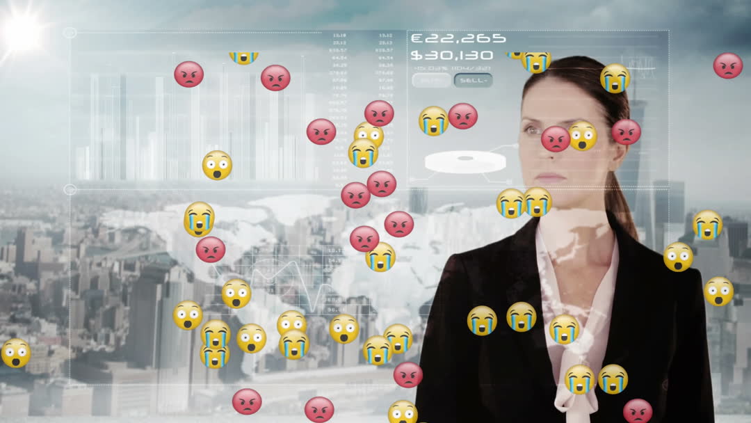 A businesswoman stands in front of a futuristic digital interface showing various data sets and graphs while expressive emojis float across, indicating communication and emotional feedback. The cityscape in the background suggests a high-tech urban setting. This illustration can be used to demonstrate modern business and technology interactions, emotional data analysis, and the impact of digital communication in a corporate environment.
