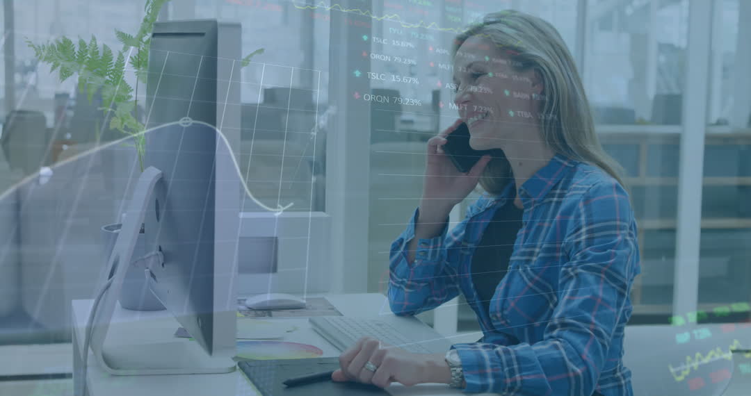 Businesswoman simultaneously converses on phone and scrutinizes financial data displayed on computer screen. Ideal for illustrating efficient workplace practices, financial services marketing, and business analysis tools emphasis.