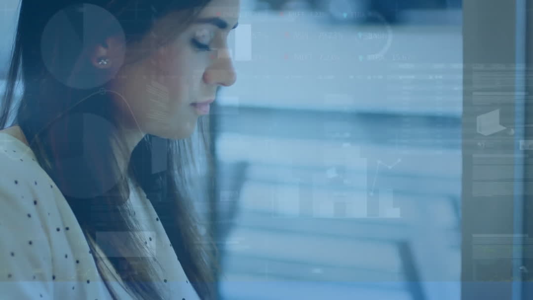 Businesswoman is intensely focused on analyzing data on her laptop in a modern cafe setting. Digital data overlays surround her, emphasizing the connection to technology and business communication. This video is ideal for illustrating concepts related to technology in everyday business life, marketing for tech-powered products, or campaigns about innovation in work environments.