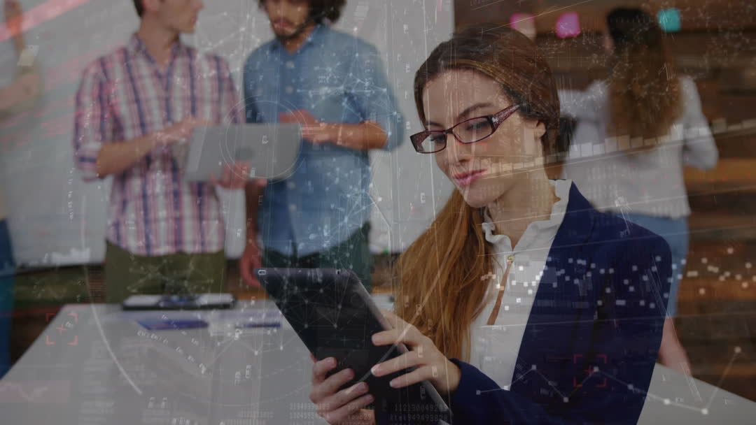 Businesswoman Analyzing Data on Tablet with Colleagues Collaborating Video