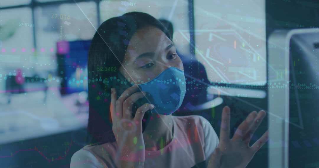 Asian businesswoman wearing a mask talks on her smartphone while interacting with digital data overlay, representing work continuity during the COVID-19 pandemic. Useful for topics related to global business adaptability, technological integration, and health safety measures in finance.