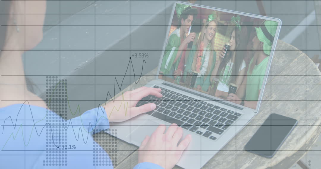 A businesswoman using a laptop displays Saint Patrick's Day festivities overlaid on data processing graphs. Useful for concepts in work-life balance, remote work culture, holiday marketing, and workspace personalization.