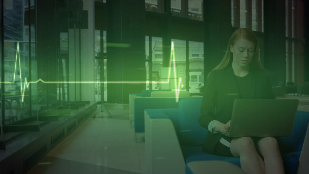 Businesswoman is working on her laptop with a digital cardiograph overlay in an office environment, indicating a focus on health-tech analytics. This visual can be used in presentations on corporate health initiatives, technology in the workplace, or innovation in data analysis fields.