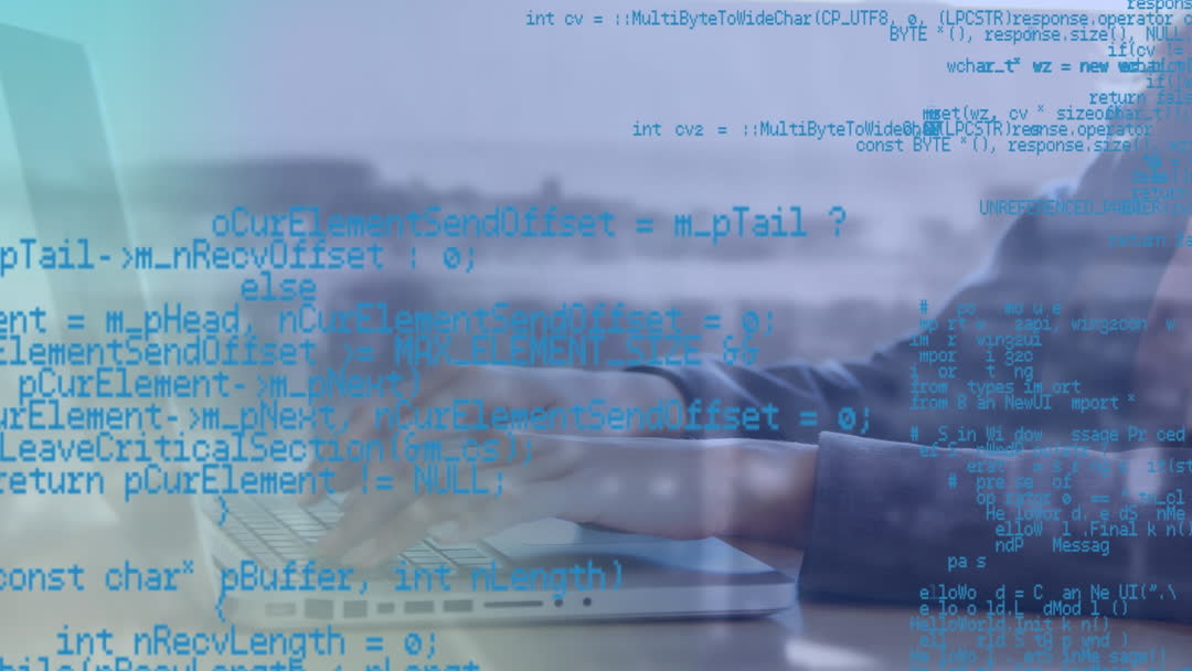 Scene shows businesswoman engaging with data processing on a laptop in a modern office. Digital code overlay represents integration of technology and business strategy planning. Ideal for illustrating concepts of digital transformations, modern working environments, and tech in business use. Useful for articles or materials on data analysis, technology-driven business, and women's role in tech industry.