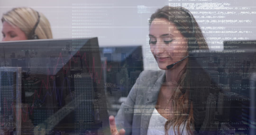 Businesswoman is multitasking using phone headset while analyzing data on a computer screen with digital overlay of data and statistics. Ideal for illustrating collaboration in tech-driven settings or global financial corporations. Useful for concepts on communication, data analysis, remote work, or financial industries.