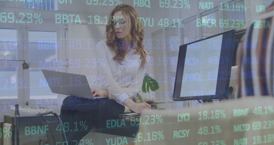 Businesswoman multitasking in a modern office environment, deeply engaged in data analysis on a laptop surrounded by digital stock statistics overlay. Suitable for illustrating concepts related to finance, digital commerce, modern technology-driven workplaces, and global business management. Perfect for business publications, websites about corporate strategy and finance, or visual content for tech-savvy environments.