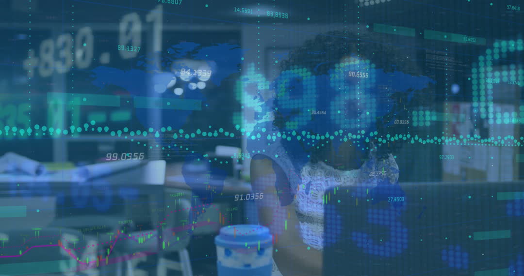 A businesswoman working on a laptop with superimposed financial data represents analysis and decision-making in a corporate setting. Useful for themes around global finance, market investments, digital analytics, or business technology enhancements.