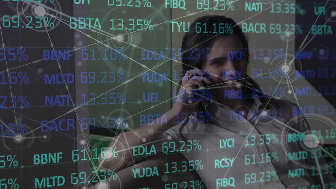 Visual representation of a businesswoman engaged in analyzing digital financial data and connections. Ideal for use in articles or presentations about global finance, economic trends, business technology, or investment strategies. Highlights themes of modern business practices and data analysis.