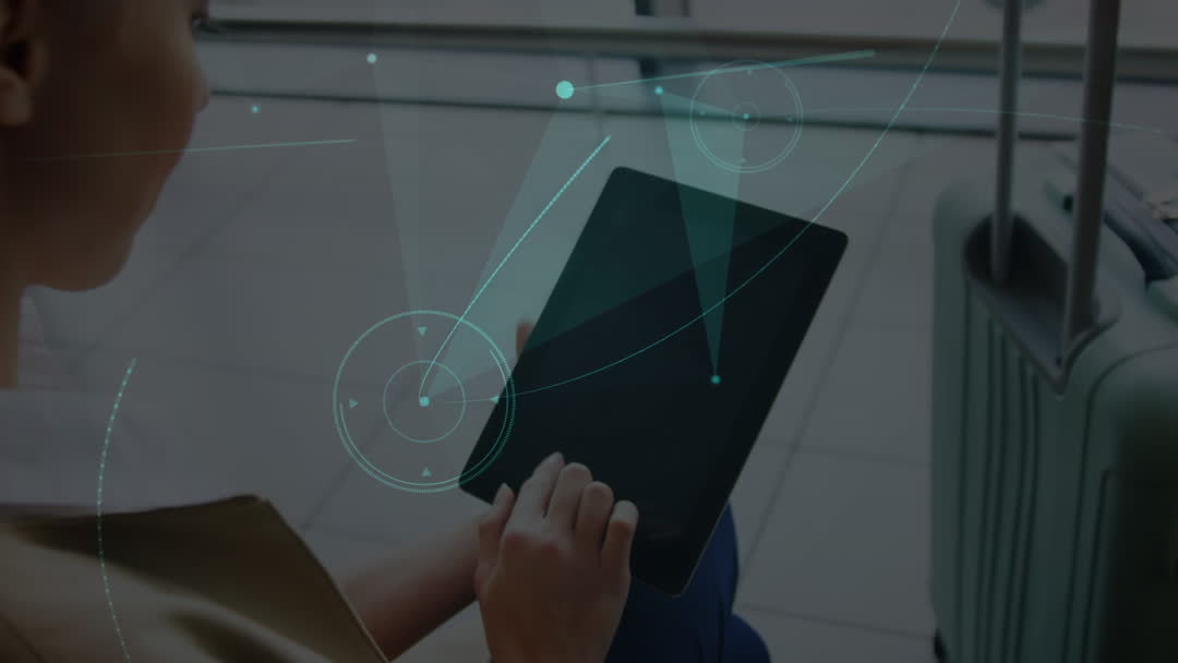 Image features a Caucasian businesswoman using a tablet device with a digital network animation overlay. Scientific data points and connections suggesting high-tech analytical purpose. Ideal for illustrating concepts of global connectivity, remote work, business travel, and modern technology solutions. Useful for corporate presentations, technology forward websites, or articles highlighting business mobility and digital innovation.
