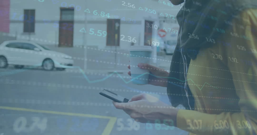 This visual captures a professional woman analyzing financial data on her smartphone. Overlay features intricate financial graphs, emphasizing technology-driven business analysis. Useful for articles on stock market trends, business technology integration, or financial planning strategies.