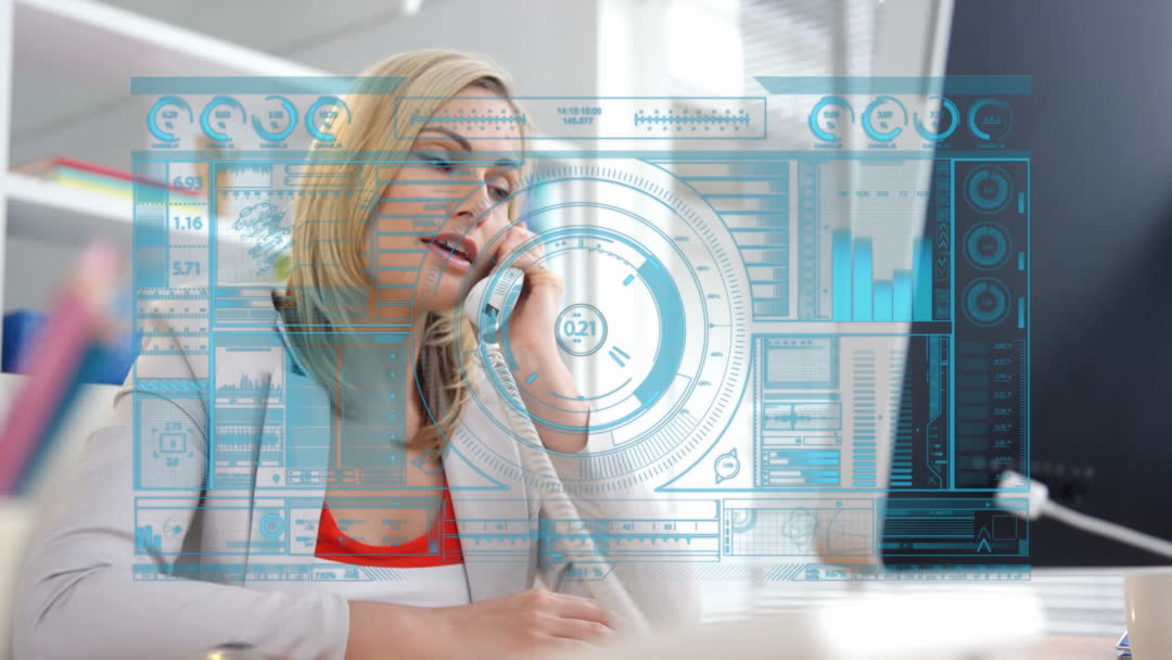 Businesswoman conducting a phone conversation while financial graphics and data overlays represent information flow and advanced data analysis. Ideal for materials focusing on business technology solutions, finance industry marketing, and showcasing cutting-edge data analysis platforms.