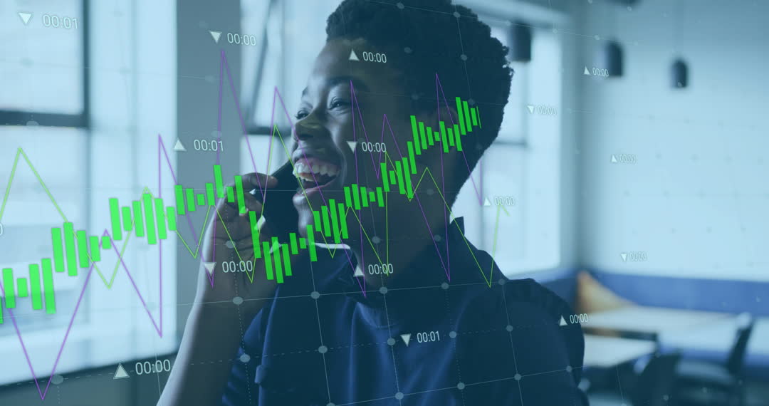 Smiling African American businesswoman conversing on smartphone with overlaid financial graphs. Useful for illustrating the concepts of business communication, technology integration in finance, trends in financial data analysis, and digital marketing contents related to commerce growth.