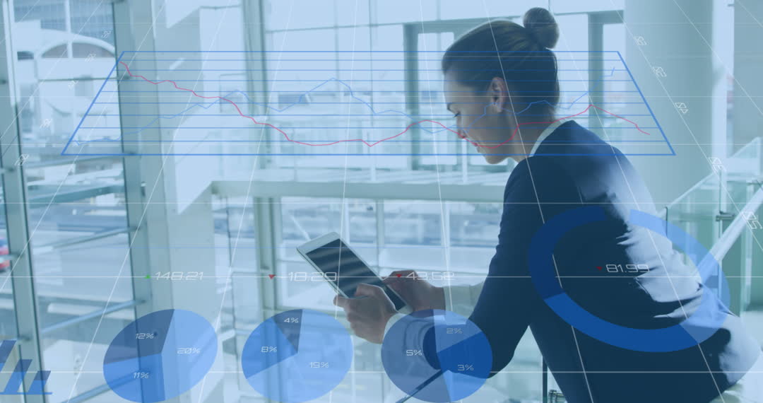 - Businesswoman Analyzing Financial Data on Tablet with Graphs Overlay