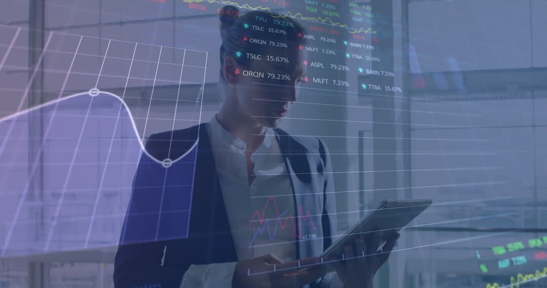 Image depicts businesswoman using tablet with overlay of financial data and graphs, conveying themes of modern finance, analytics, and corporate management. Useful for articles and presentations related to financial technology, market analysis, or corporate growth strategies.