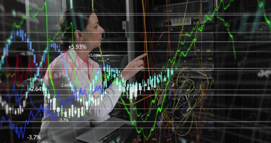 Businesswoman interacting with server equipment while financial graphs overlay screen. Represents intersection of finance and technology, financial strategies, real-time data processing, and cryptocurrency analysis. Ideal for illustrating concepts in financial technology, market analysis, business strategy, and digital entrepreneurship.