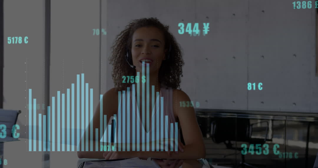 Businesswoman sitting at desk in an office, with dynamic financial data and graphs digitally overlaid, symbolizing active analysis of market trends. Graphs display currency and statistics, enhancing the modern business and finance context. Suitable for illustrating concepts of financial management, economic strategy, and stock market projections in presentations or articles related to business or commerce.