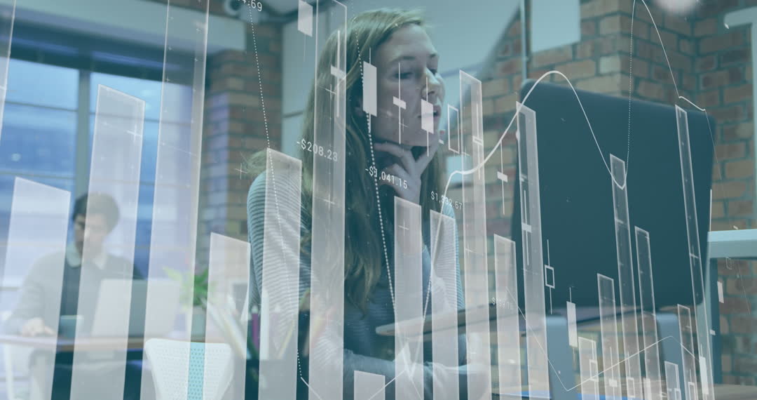 - Businesswoman Analyzing Financial Data with Overlaid Charts