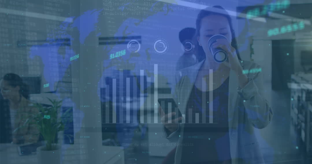Scene depicting businesswoman examining financial data and graphs superimposed with digital interface shows focus on market analysis and financial strategy. Ideal for business presentations or illustrating modern finance concepts.