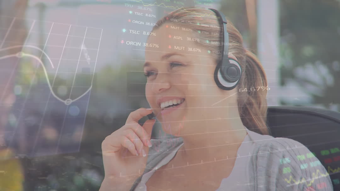 Businesswoman Analyzing Financial Statistics with Headset Video