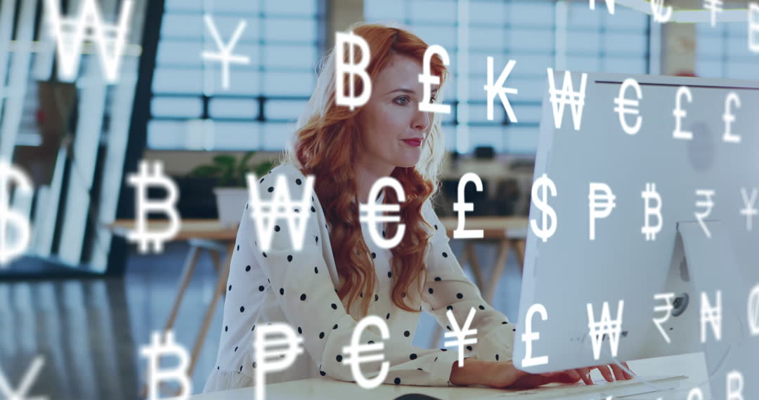 Businesswoman working on laptop with overlay of global currency symbols in corporate setting. Ideal for illustrating concepts of global finance, economic analysis, digital technology in biz, currency exchange, international business growth, or data analysis.