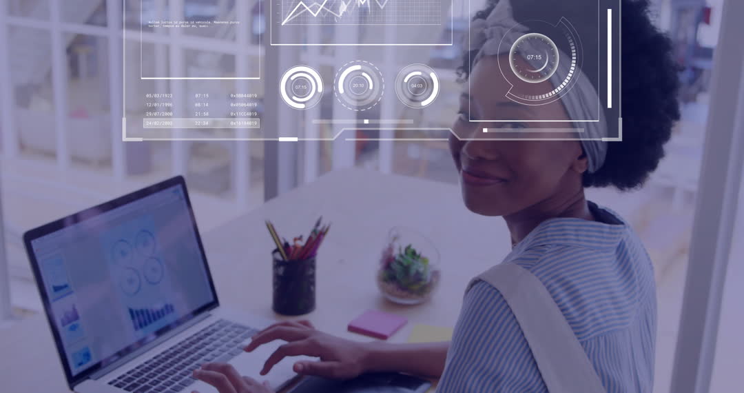 A professional and tech-savvy scene depicting an African American businesswoman working on a laptop in an office. Multiple transparent digital data overlays appear on the video, showing graphs and data processing visuals, hinting at advanced analytics. Suitable for promoting themes related to business, technology, finance, analytics, and digital workflow. Ideal for use in articles, presentations, or advertisements focusing on workplace technology and professional development.