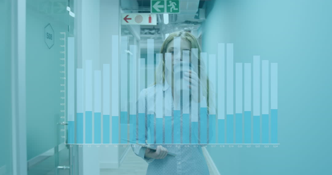 Businesswoman carrying coffee walking through an office hallway with financial graphs overlaid. Ideal for depicting concepts in business analysis, financial strategy, and corporate work environments. Perfect for use in presentations, business articles, and advertisements related to economic growth and management tools.