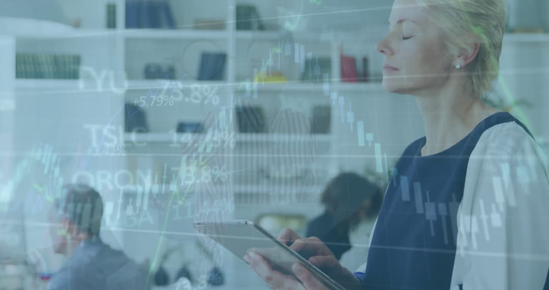 Businesswoman using a tablet with digital stock market graphs overlaying. Conceptual video of technology enabling financial analysis. Ideal for illustrating themes of modern business, financial services, and technology-driven insights.