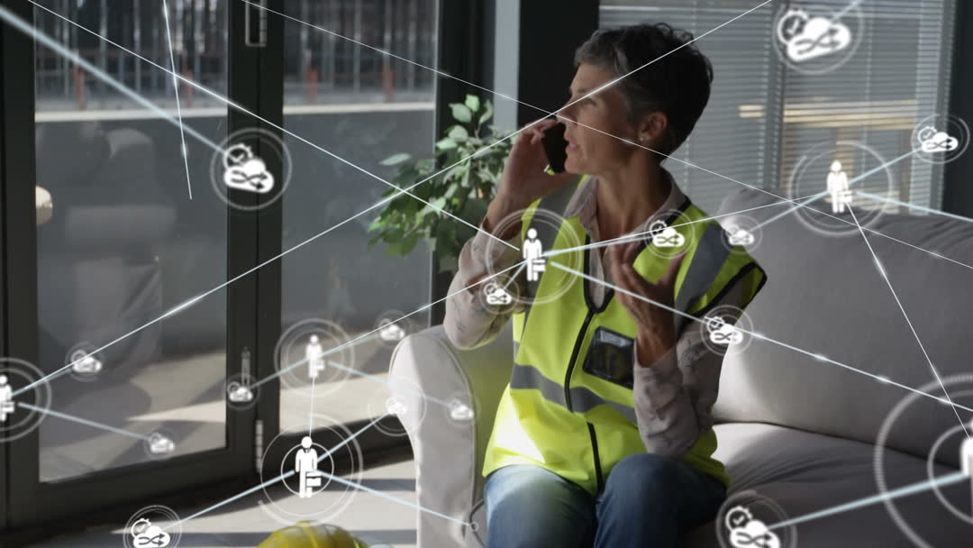 Businesswoman seated on white couch, wearing high visibility jacket, engages with smartphone to contemplate interlinked network connection icons. Digitally generated concept illustrates modern communication technology and networking crucial for global business strategies. Ideal for applications related to business communication, tech development, remote work, engineering, and strategic planning.