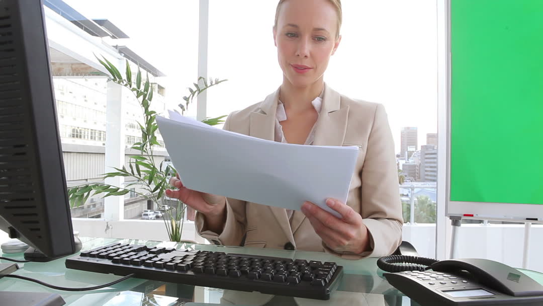 Businesswoman is sitting at a desk in a modern office setting, reviewing documents attentively with a computer and telephone nearby. The scene denotes a professional and focused business environment, suitable for illustrating concepts like corporate productivity, multitasking in the workplace, and business communication. Ideal for use in business and financial magazines, executive profiles, and corporate themed presentations.